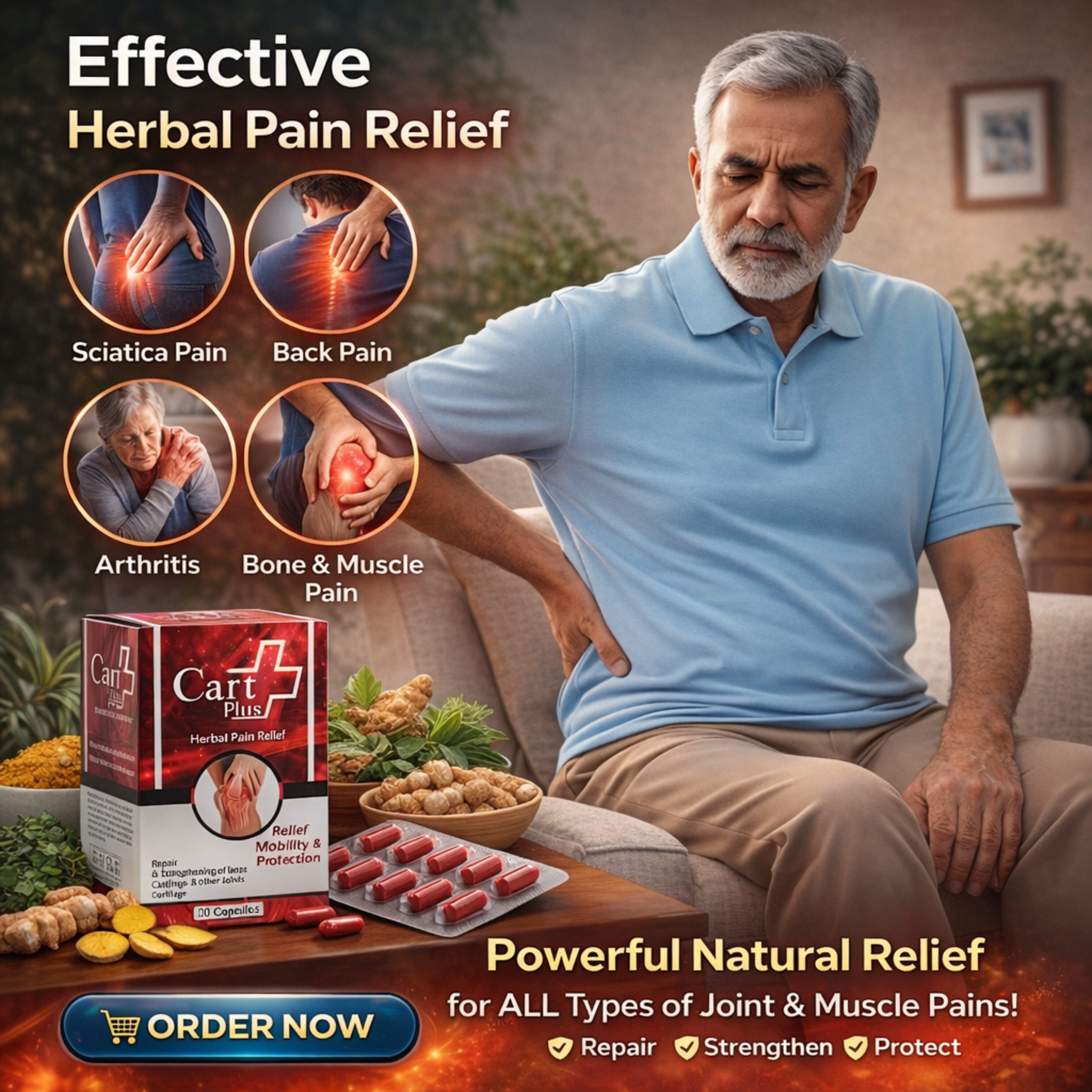 "Restore your mobility with Cart Plus Herbal Pain Relief. A natural, powerful solution for back and joint pain. Get 30 capsules of pure herbal strength to help you live an active, pain-free life. Shop now and feel the relief!"